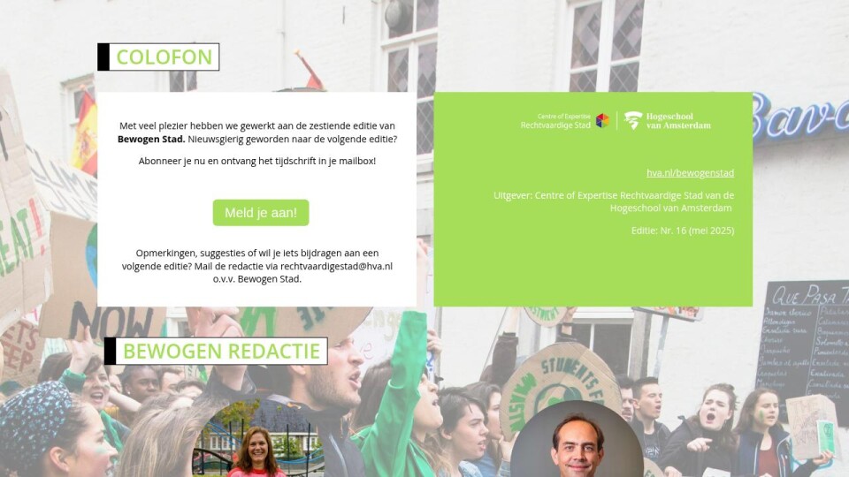 Opmerkingen, suggesties of wil je iets bijdragen aan een volgende editie? Mail de redactie via rechtvaardigestad@hva.nl o.v.v. Bewogen Stad.