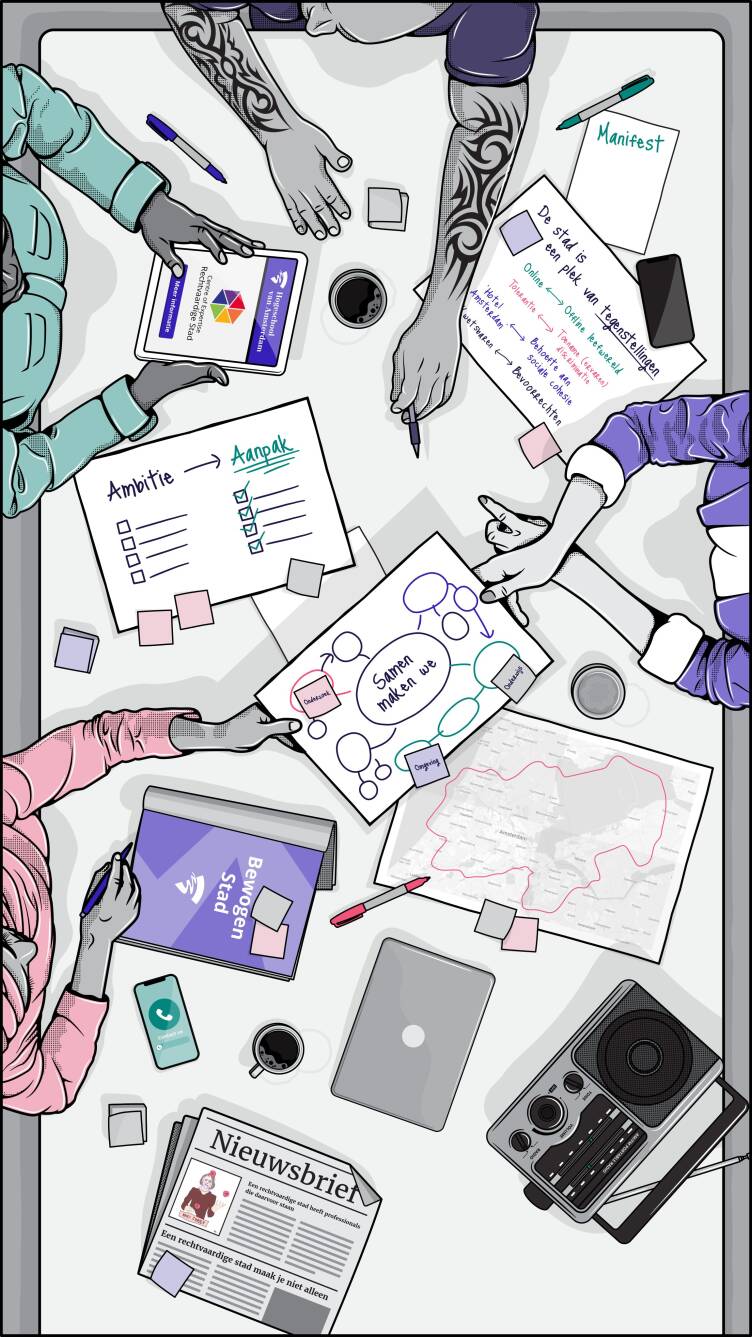 Maar wat staat en ligt er op onze tafel? Je vindt er de mensen met wie we optrekken. Je leest waarom we doen wat we doen. Je vindt er onze strategie, met daarin onze ambitie en hoe we die in de praktijk proberen te brengen. Die praktijk vind je op de tafel terug in de vorm van ons blad Bewogen Stad, de Bewogen Podcast en onze Maandelijkse nieuwsbrief. Via het telefoontje kom je met ons in contact. We horen je graag, want Een rechtvaardige stad heeft professionals nodig die daarvoor staan.