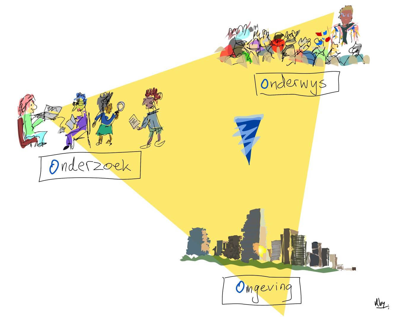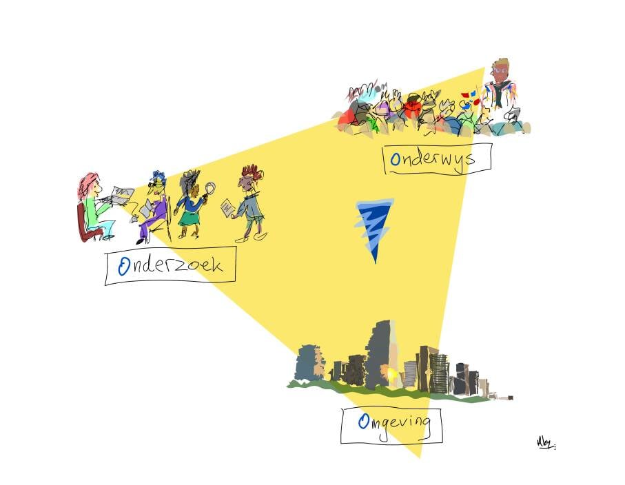 Maar naast Onderzoek zit ook het Onderwijs aan tafel. Door docenten van verschillende opleidingen te betrekken, lukt het om de cirkel rond te maken. Zij vertalen de gesprekken en onderzoeksresultaten naar het onderwijs. En het onderwijs is de plek waar de toekomstige professional wordt opgeleid, zodat die rechtvaardige stad professionals krijgt die daarvoor staan.