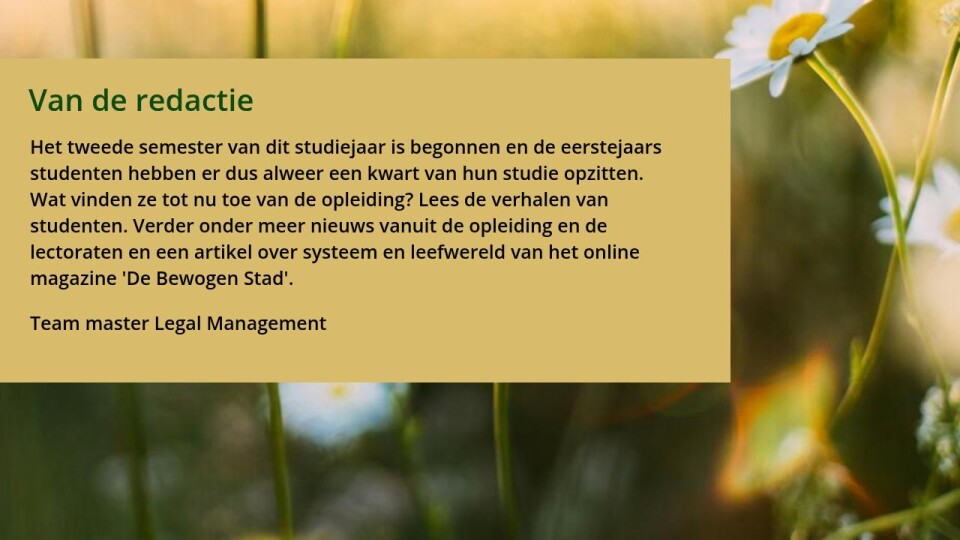 Het tweede semester van dit studiejaar is begonnen en de eerstejaars studenten hebben er dus alweer een kwart van hun studie opzitten. Wat vinden ze tot nu toe van de opleiding? Lees de verhalen van studenten. Verder onder meer nieuws vanuit de opleiding en de lectoraten en een artikel over systeem en leefwereld van het online magazine 'De Bewogen Stad'.