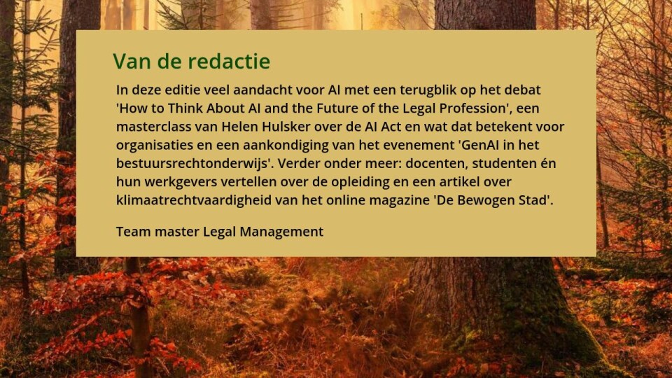 In deze editie veel aandacht voor AI met een terugblik op het debat 'How to Think About AI and the Future of the Legal Profession', een masterclass van Helen Hulsker over de AI Act en wat dat betekent voor organisaties en een aankondiging van het evenement 'GenAI in het bestuursrechtonderwijs'. Verder onder meer: docenten, studenten én hun werkgevers vertellen over de opleiding en een artikel over klimaatrechtvaardigheid van het online magazine 'De Bewogen Stad'.
